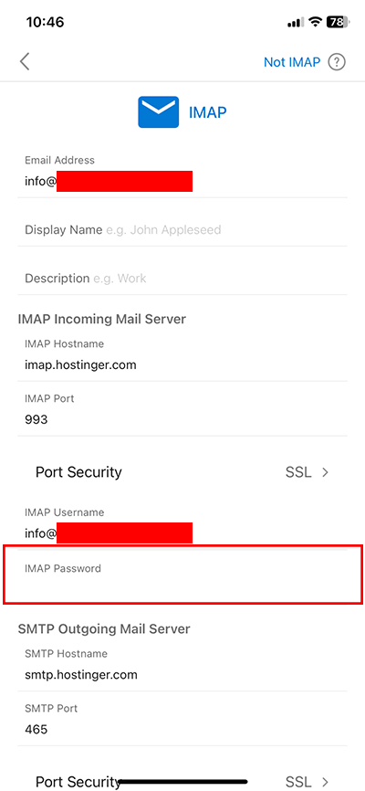 | Host: imap.hostinger.com Encryption: SSL Port number: 993 |
