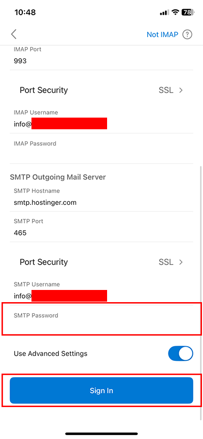 Now, enter your email password in both the “IMAP Password” and “SMTP Password” fields, then click “Sign In.”